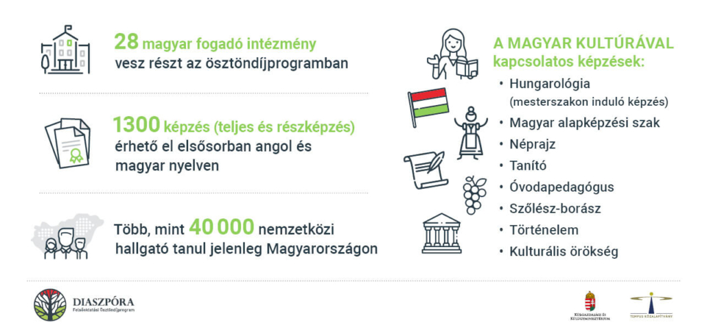 Diaszpóra ösztöndíjasként nemzetközileg elismert végzettséget szerezhetsz a legjobb magyar felsőoktatási intézmények valamelyikénél, miközben a személyes és tanulmányi fejlődéshez nélkülözhetetlen versenyképes tudásra teszel szert. Közel 30 felsőoktatási intézmény 1300 magyar és angol nyelvű képzéséből válogathatsz minden felsőoktatási terület bármely képzési szintjén. Az ösztöndíj diplomát adó teljes képzésekre, valamint végzettséget nem adó tanulmányokra is pályázható, beleértve az egy vagy két szemeszter hosszú részképzést.